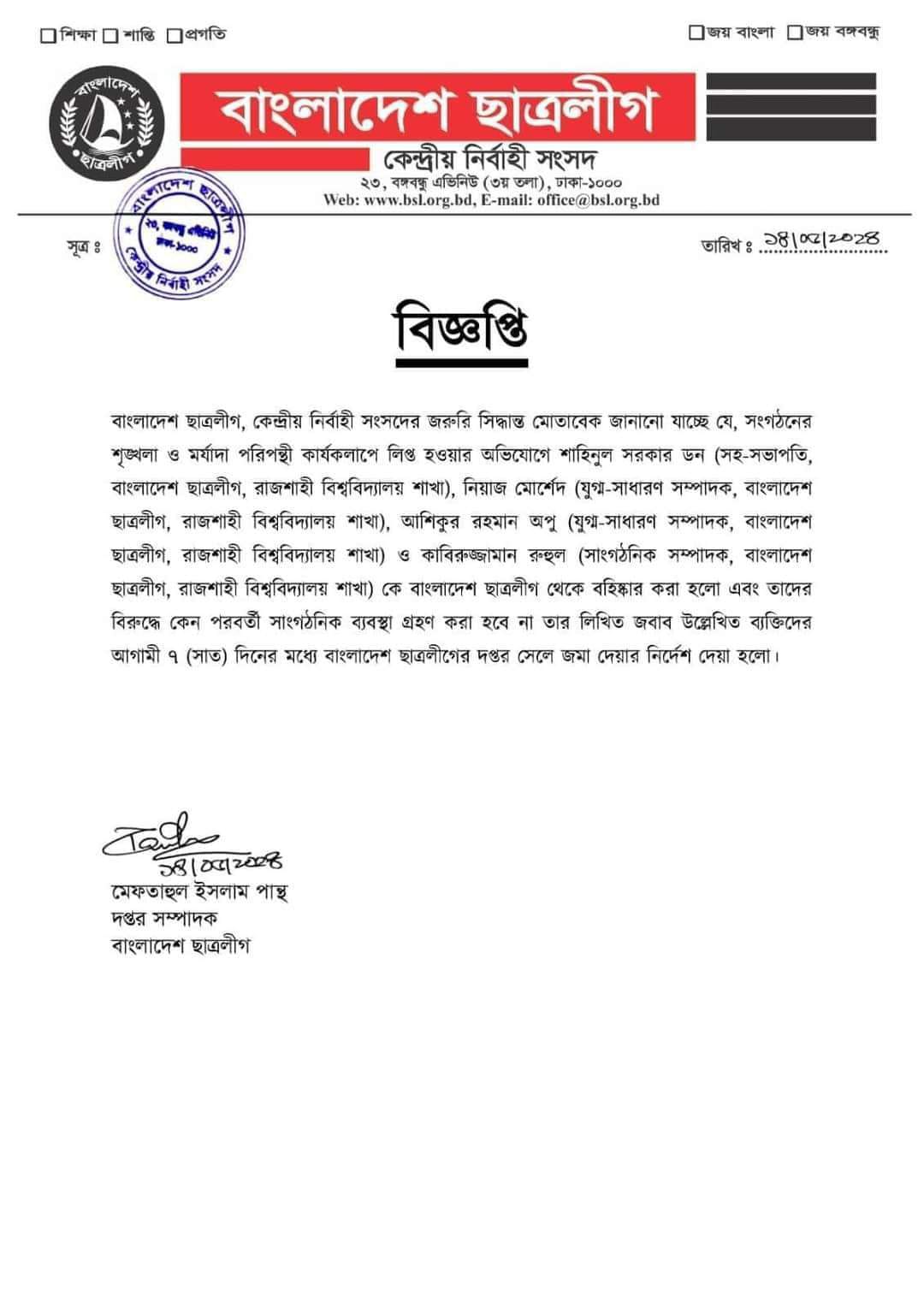 বিজ্ঞপ্তিতে বলা হয়, বাংলাদেশ ছাত্রলীগ, কেন্দ্রীয় নির্বাহী সংসদের জরুরি সিদ্ধান্ত মোতাবেক জানানো যাচ্ছে যে, সংগঠনের শৃঙ্খলা ও মর্যাদা পরিপন্থী কার্যকলাপে লিপ্ত হওয়ার অভিযোগে শাহিনুল সরকার ডন (সহ-সভাপতি, বাংলাদেশ ছাত্রলীগ, রাজশাহী বিশ্ববিদ্যালয় শাখা), নিয়াজ মোর্শেদ (যুগ্ম-সাধারণ সম্পাদক, বাংলাদেশ ছাত্রলীগ, রাজশাহী বিশ্ববিদ্যালয় শাখা), আশিকুর রহমান অপু (যুগ্ম-সাধারণ সম্পাদক, বাংলাদেশ ছাত্রলীগ, রাজশাহী বিশ্ববিদ্যালয় শাখা) ও কাবিরুজ্জামান রুহুল (সাংগঠনিক সম্পাদক, বাংলাদেশ ছাত্রলীগ, রাজশাহী বিশ্ববিদ্যালয় শাখা) কে বাংলাদেশ ছাত্রলীগ থেকে বহিষ্কার করা হলো এবং তাদের বিরুদ্ধে কেন পরবর্তী সাংগঠনিক ব্যবস্থা গ্রহণ করা হবে না তার লিখিত জবাব উল্লেখিত ব্যক্তিদের আগামী ৭ (সাত) দিনের মধ্যে বাংলাদেশ ছাত্রলীগের দপ্তর সেলে জমা দেয়ার নির্দেশ দেয়া হলো।